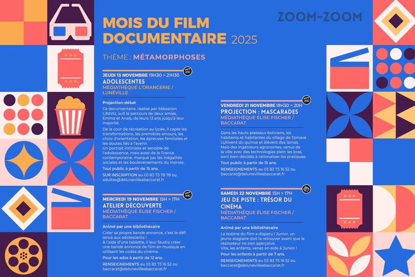 🎬 Le Mois du Film Documentaire dans le réseau des Médiathèques du Lunévillois 🎥 En novembre, place au Mois du Film Documentaire ! Cette année, le thème « Métamorphoses » invite à explorer le changement sous toutes ses formes. 📽️ Les médiathèque de Baccarat et Lunéville participent à cet événement…